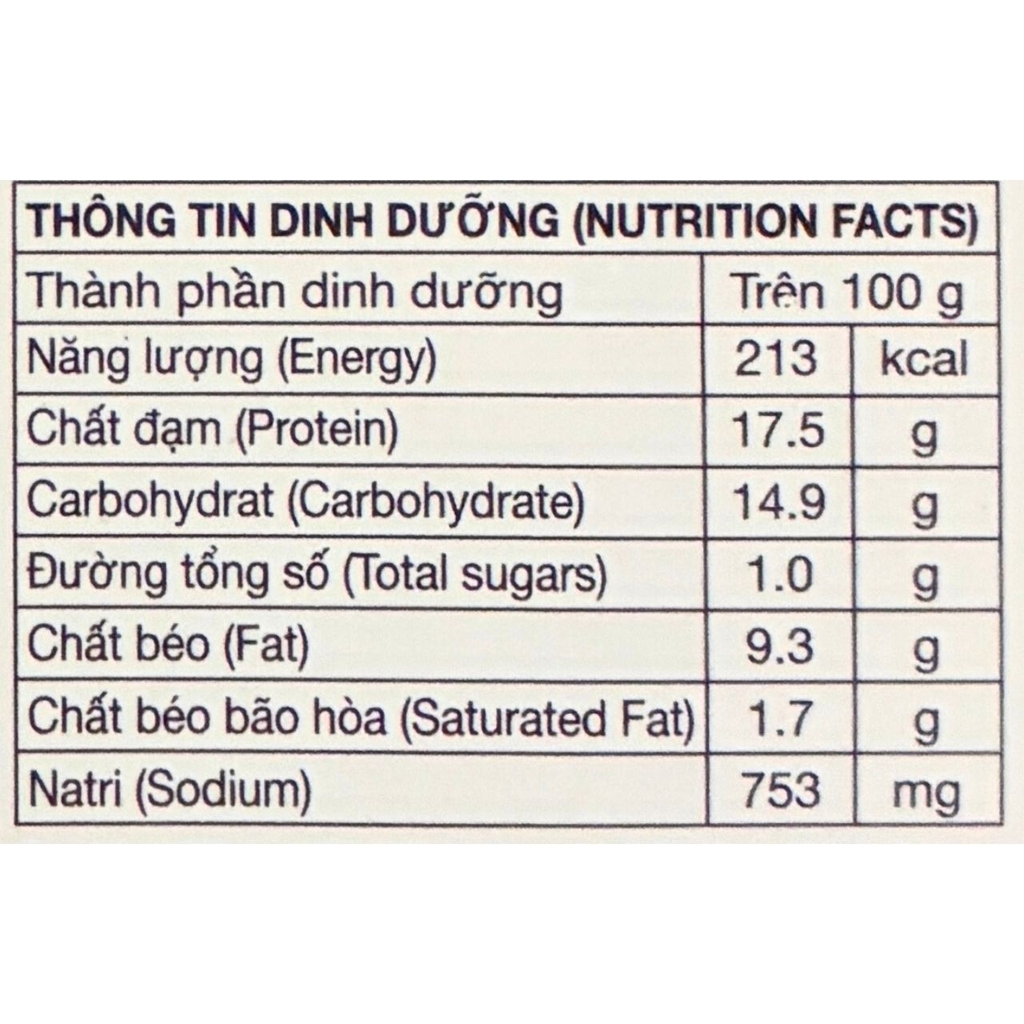Sản phẩm được tẩm ướp và sơ chế vệ sinh, giàu năng lượng, protein, chất béo, chất đạm, natri và các dưỡng chất khác.