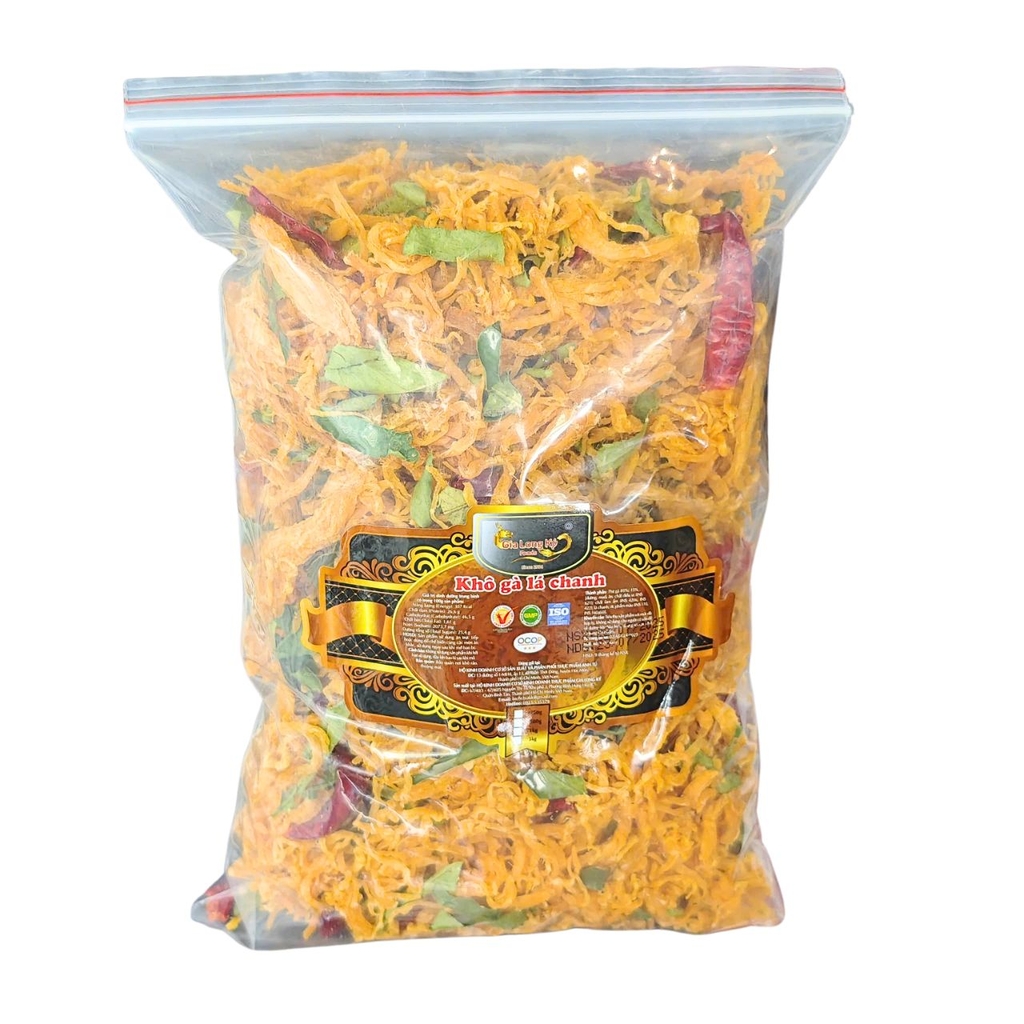 Khô Gà Lá Chanh Gia Long Ký là món ăn vặt cao cấp, được chế biến từ 95% thịt gà tươi nguyên chất kết hợp cùng gia vị truyền thống, lá chanh tươi và ớt sấy. Từng sợi gà vàng óng, thơm lừng, vị cay nhẹ và béo ngọt tự nhiên – cực kỳ cuốn miệng.